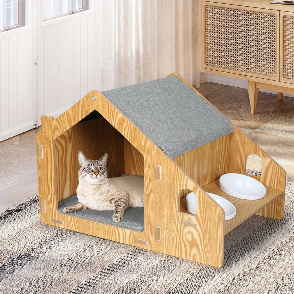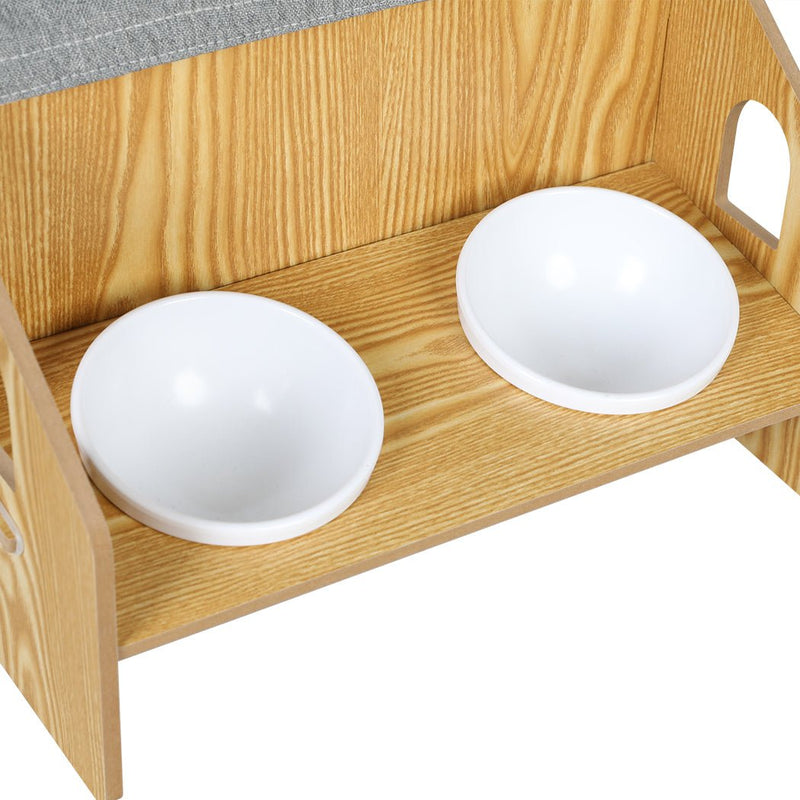 Haustierhütte aus Holz mit erhöhten Doppel-Futternäpfen