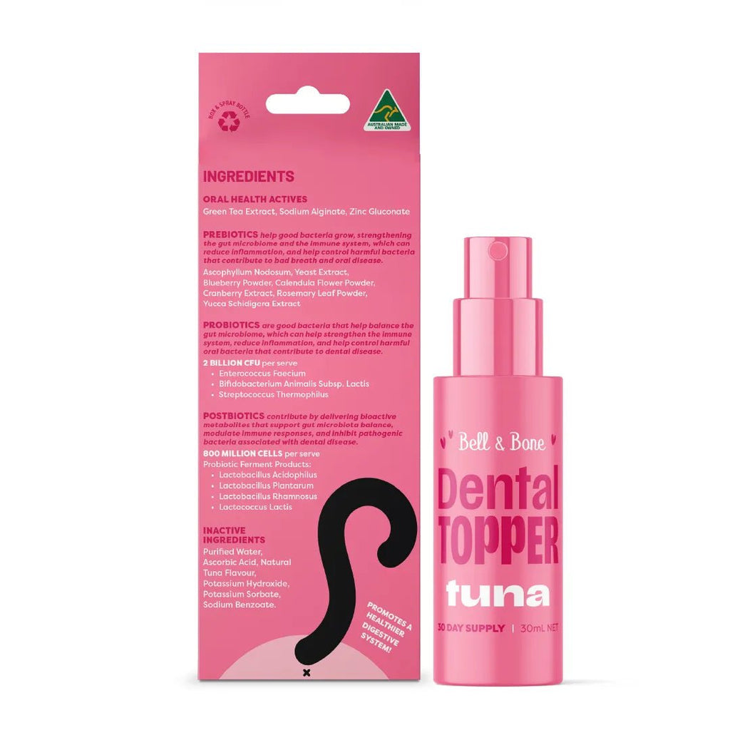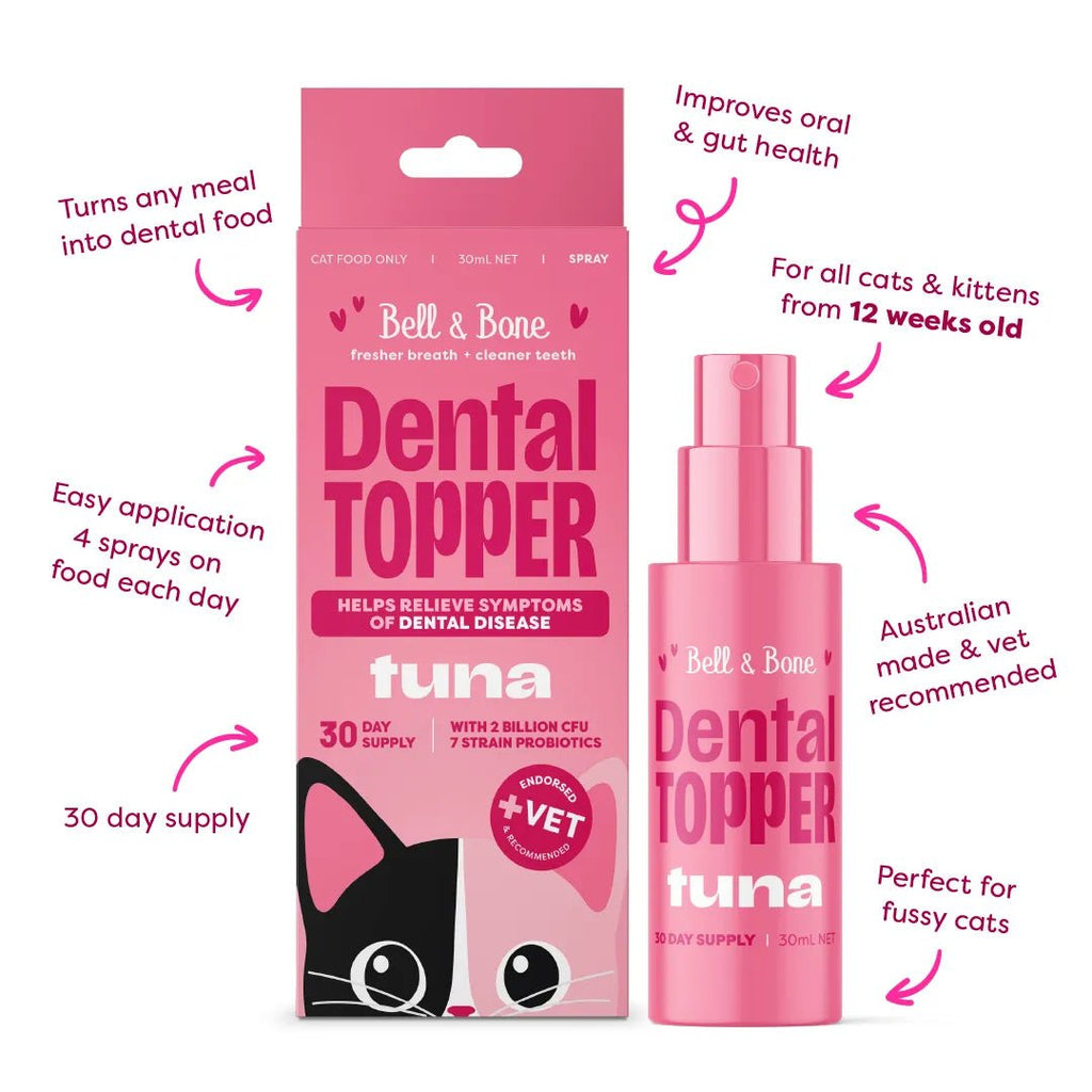 Bell & Bone’s Dental Topper combines oral actives and our unique powerful tribiotic blend (prebiotics, probiotics and postbiotics) to fight dental disease at the root cause—the gut, by turning your cat's favourite meal into dental food in just 4 sprays daily.